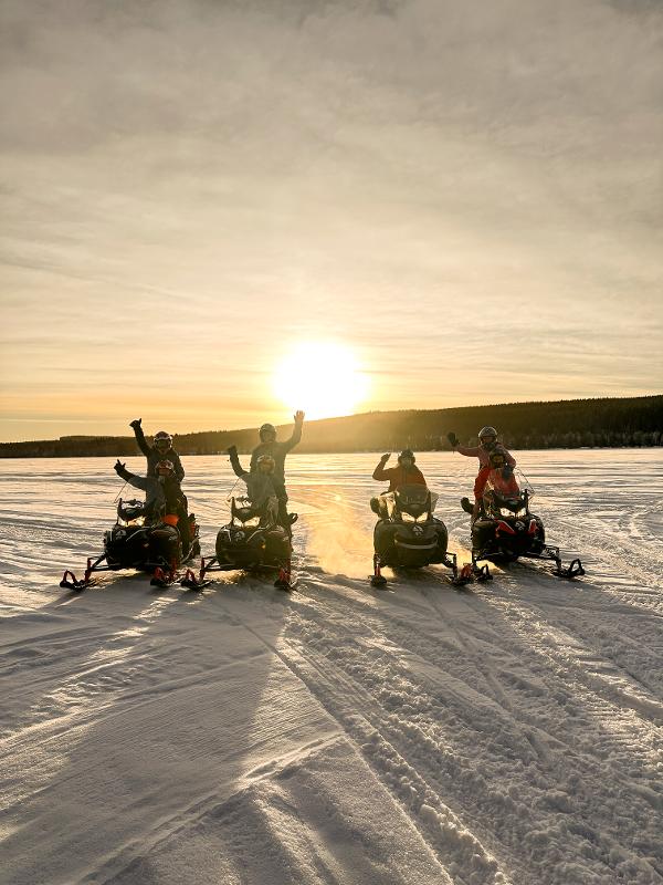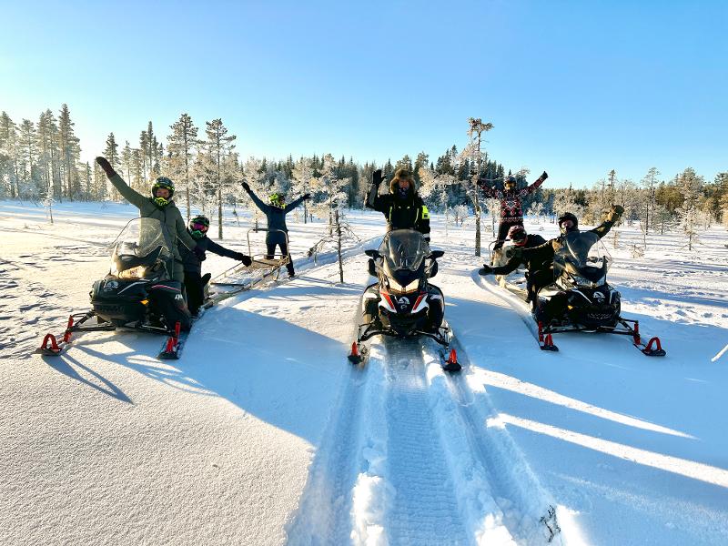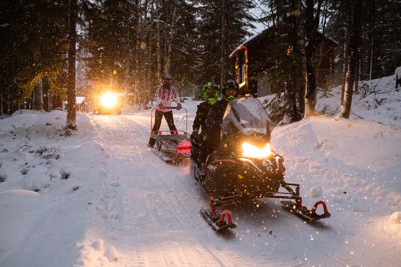 Erkundet die weite Winterlandschaft mit dem Schneemobil. Ihr könnt in einem Schlitten hinter dem Schneemobil Platz nehmen oder als Beifahrer bei einem Guide mitfahren. Ihr fahrt quer durch Wälder und über zugefrorene Seen. Vielleicht entdeckt ihr sogar einen Elch oder andere Wildtiere!
