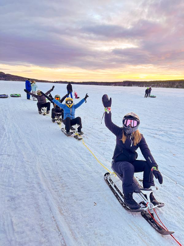 Haltet euch an einem Seil fest und lasst euch von einem Schneemobil ziehen. Mit Schlitten, Reifen oder Skiern werdet ihr in angepasstem Tempo über den See gezogen. Zwischendurch geniesst ihr ein leckeres Mittagessen und eine heisse Tasse Kaffee oder Kakao.